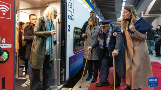 10月3日,在塞爾維亞首都貝爾格萊德,工作人員陪同塞爾維亞105歲的老人(右二)搭乘中企承建的匈塞鐵路列車。新華社發(fā)(王韡攝)
