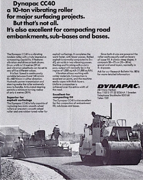 戴納派克壓實技術(shù)的發(fā)展歷程,幾乎涵蓋了現(xiàn)代壓實技術(shù)創(chuàng)新與研發(fā)積累的完整歷程。從早期的混凝土振搗器專利,到振動式土壤壓路機的問世,再到“Ball-and-race 原理的專利發(fā)明,至1958年的世界首臺振動式土壤壓路機和1970年問世的世界上第一臺單鋼輪壓路機CA25,而在路面技術(shù)領(lǐng)域,隨著瀝青的廣泛應(yīng)用,戴納派克具有劃時代意義的CC型號瀝青壓路機CC40也開始在60年代正式登場。而這諸多的“第一”絕非空中樓閣,每一項“首創(chuàng)”都凝聚著戴納派克的大量實踐驗證積累和對技術(shù)極致追求的智慧結(jié)晶。