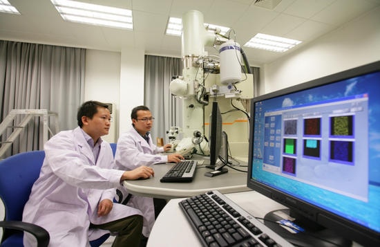 圖為江蘇?。ㄉ充摚╀撹F研究院研究人員操作分析檢測設(shè)備