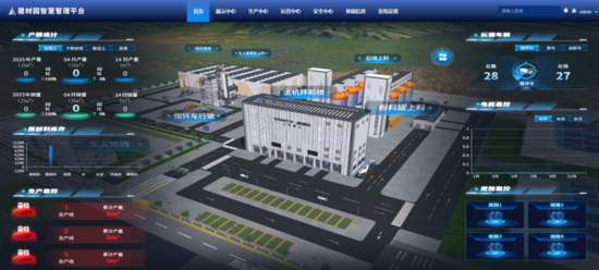 山推建友數(shù)字孿生技術的集成應用在智慧建材園建設中取得了革命性突破,以山東某智慧園區(qū)為例,其三維數(shù)字孿生系統(tǒng)實現(xiàn)了生產全流程的精準映射與優(yōu)化控制,從原材料進場智能過磅(效率提升80%)、AI料位精準監(jiān)測(誤差<3噸),到庫存實時管理、智能上料(骨料)與氣力輸送(粉料)、攪拌主機作業(yè)、質量檢測,最終實現(xiàn)成品智能調度。同時,雙控雙機系統(tǒng)有效減少人工50%,大幅提升園區(qū)運營智能化水平。