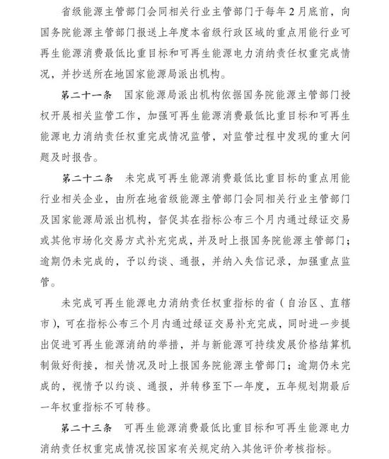 10月13日,國(guó)家發(fā)展改革委就《可再生能源消費(fèi)最低比重目標(biāo)和可再生能源電力消納責(zé)任權(quán)重制度實(shí)施辦法(征求意見稿)》向社會(huì)公開征求意見。其中指出,未完成可再生能源消費(fèi)最低比重目標(biāo)的重點(diǎn)用能行業(yè)相關(guān)企業(yè),由所在地省級(jí)能源主管部門會(huì)同相關(guān)行業(yè)主管部門及國(guó)家能源局派出機(jī)構(gòu),督促其在指標(biāo)公布三個(gè)月內(nèi)通過綠證交易或其他市場(chǎng)化交易方式補(bǔ)充完成,并及時(shí)上報(bào)國(guó)務(wù)院能源主管部門;逾期仍未完成的,予以約談、通報(bào),并納入失信記錄,加強(qiáng)重點(diǎn)監(jiān)管。