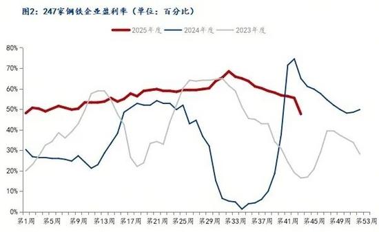 從市場基本面看,供需兩端的失衡持續(xù)加劇。9月上旬全國21個(gè)城市五大品種鋼材庫存攀升至920萬噸,同比增幅4.1%,庫存壓力已連續(xù)三個(gè)月高于去年同期。需求端則受房地產(chǎn)低迷拖累,1-8月房地產(chǎn)開發(fā)投資同比下降12.9%,鋼材終端消費(fèi) 旺季不旺成為常態(tài)。即便如此,鋼廠主動(dòng)減產(chǎn)的動(dòng)力依然不足。截至10月27日 Mysteel調(diào)研247家鋼廠高爐開工率84.71%,環(huán)比上周增加0.44個(gè)百分點(diǎn),同比去年增加2.57個(gè)百分點(diǎn) 。高爐煉鐵產(chǎn)能利用率89.94%,環(huán)比上周減少0.39個(gè)百分點(diǎn) ,同比去年增加1.46個(gè)百分點(diǎn);鋼廠盈利率47.62%,環(huán)比上周減少7.79個(gè)百分點(diǎn),同比去年減少17.32個(gè)百分點(diǎn);日均鐵水產(chǎn)量239.9萬噸,環(huán)比上周減少1.05萬噸,同比去年增加4.21萬噸。 盈利鋼企平均噸鋼利潤較 8 月下降 18.3%,二季度以來的盈利高峰已逐步消退。其中,頭部鋼企憑借前期低價(jià)原料鎖定、高端鋼材產(chǎn)品結(jié)構(gòu)優(yōu)勢,盈利韌性相對(duì)較強(qiáng),但也面臨訂單增速放緩的壓力。中小鋼廠則因以螺紋鋼等普通建材為主,深陷“訂單不足 - 降價(jià)搶單 - 利潤收窄”的惡性循環(huán),部分中小普鋼企業(yè)的螺紋鋼業(yè)務(wù)噸鋼利潤已跌破 30 元,較二季度峰值縮水超 80%,雖未虧損卻已逼近盈利臨界點(diǎn)。