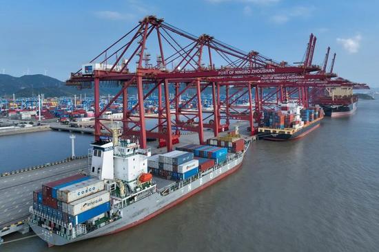 在寧波舟山港金塘港區(qū)大浦口集裝箱碼頭,船舶進行集裝箱裝卸作業(yè)。新華社發(fā)(鄒訓永攝)