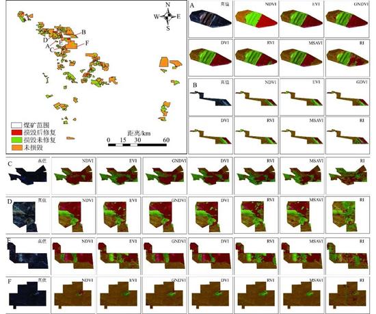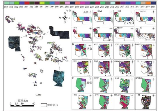 在研究發(fā)現(xiàn)上,揭示了不同植被指數(shù)在露天礦植被擾動(dòng)過(guò)程中的響應(yīng)特性與適用邊界,明確了煤炭基地尺度下 NDVI、GNDVI、DVI 三種植被指數(shù)的優(yōu)勢(shì),同時(shí)發(fā)現(xiàn)單個(gè)礦區(qū)尺度上植被覆蓋度與各植被指數(shù)識(shí)別準(zhǔn)確度的關(guān)聯(lián),以及不同指數(shù)在植被損毀和修復(fù)不同階段的響應(yīng)差異,為不同場(chǎng)景下植被指數(shù)的合理選取提供了精細(xì)化的科學(xué)依據(jù)。