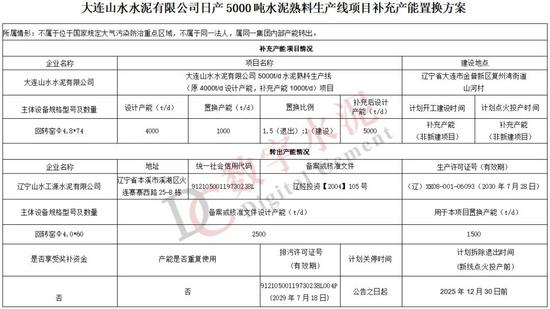 其中,遼寧山水工源水泥有限公司2500t/d產(chǎn)能拆分成1500t/d和1000t/d,分別用于大連山水水泥有限公司5000t/d和本公司6000t/d熟料項目補充產(chǎn)能,該生產(chǎn)線計劃2025年12月30日前拆除退出,具體如下:
