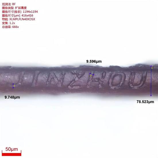 金洲公司0.01MM極小徑銑刀在頭發(fā)絲上加工7個字母(圖為光學顯微鏡下放大666倍顯示)