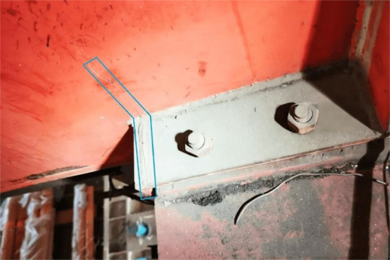 我們分析了一臺(tái)使用12年的5噸31.5米單梁起重機(jī),其主梁端部出現(xiàn)裂紋(圖中藍(lán)色方框)。以下是原因分析和修復(fù)建議,供您參考。
