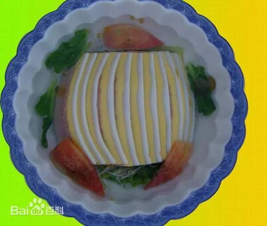 主要用料是雞蛋、淀粉、豆腐、精豬肉和羹料木耳、黃花等。蛋清、蛋黃、肉末等分層搭配制作,形成上黃、中白、下肉色,置于大品碗中,整齊切塊覆蓋在羹料上,在籠中蒸熟,放足佐料上席,香氣外溢,噴香撲鼻。這種菜,酥軟粑和,美味質(zhì)口,極富營養(yǎng)價值,老少咸宜,深受喜愛,故上席即置于正中央,威鎮(zhèn)四方,且形如寶蓋,造型美觀,味美可口。