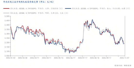 2025年華北熱軋板卷價(jià)格整體呈震蕩下行態(tài)勢(shì),核心運(yùn)行區(qū)間圍繞3250-3380元/噸波動(dòng)。截至11月7日,全國(guó)4.75mm普卷均價(jià)3365元/噸,華北區(qū)域價(jià)格低于全國(guó)平均水平,其中天津、邯鄲、唐山市場(chǎng)4.75mm Q235B熱卷報(bào)價(jià)3190元/噸,北京報(bào)價(jià)3320元/噸,石家莊3270元/噸,周環(huán)比下調(diào)40-60元/噸。價(jià)格走勢(shì)呈現(xiàn)兩大特點(diǎn):一是原料端傳導(dǎo)滯后,成本支撐減弱拖累熱卷價(jià)格;二是期貨與現(xiàn)貨聯(lián)動(dòng)性增強(qiáng),市場(chǎng)情緒謹(jǐn)慎導(dǎo)致貿(mào)易商以價(jià)換量操作增多。11月以來(lái),區(qū)域價(jià)格累計(jì)跌幅達(dá)2%,顯著弱于華東、華南市場(chǎng),主要受本地供應(yīng)壓力與需求復(fù)蘇乏力影響。