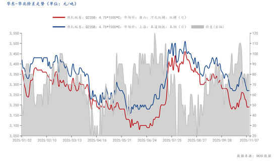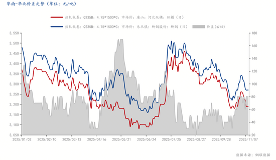 全國(guó)范圍內(nèi),華北與華東、華南區(qū)域價(jià)差呈現(xiàn)穩(wěn)定格局。截至11月7日,4.75mm普卷華東(上海)與華北(唐山)價(jià)差80元/噸,華南(樂(lè)從)與華北(唐山)價(jià)差70元/噸,華北價(jià)格處于全國(guó)低位,主要因本地供應(yīng)充足而需求相對(duì)疲軟。區(qū)域內(nèi)來(lái)看,京津冀市場(chǎng)價(jià)差溫和,唐山與天津、邯鄲價(jià)差均為10元/噸,北京、石家莊因流通成本較高,價(jià)格較唐山高出60-80元/噸,整體價(jià)差結(jié)構(gòu)穩(wěn)定,未出現(xiàn)顯著套利空間。與前期相比,華南與華北價(jià)差正向縮小10元/噸,華東與華北價(jià)差正向擴(kuò)大,反映區(qū)域市場(chǎng)供需分化加劇。