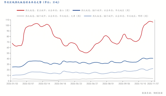 2025年華北熱軋板卷庫(kù)存打破季節(jié)性規(guī)律,累庫(kù)節(jié)奏前移且壓力持續(xù)累積。截至11月7日,全國(guó)熱軋板卷社會(huì)庫(kù)存333.02萬(wàn)噸,周環(huán)比增加4.09萬(wàn)噸,其中華北區(qū)域雖呈現(xiàn)周度去庫(kù)0.84萬(wàn)噸的局部改善,但庫(kù)存基數(shù)仍處于年內(nèi)高位,部分貿(mào)易商庫(kù)存壓力指數(shù)已接近警戒線。分類型來(lái)看,鋼廠庫(kù)存108.09萬(wàn)噸,周環(huán)比增加3.99萬(wàn)噸,顯示鋼廠主動(dòng)去庫(kù)意愿不足,庫(kù)存壓力向流通環(huán)節(jié)轉(zhuǎn)移趨勢(shì)明顯;社會(huì)庫(kù)存中,天津、唐山等主要流通節(jié)點(diǎn)庫(kù)存占比超60%,資源積壓導(dǎo)致貿(mào)易商資金周轉(zhuǎn)壓力上升。與往年同期相比,當(dāng)前庫(kù)存較2024年同期增加47.91萬(wàn)噸,且節(jié)后下游復(fù)工率僅52%,較同期低28%,庫(kù)存消化缺乏需求支撐。